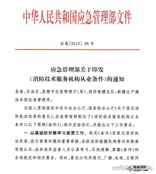 為深入貫徹落實中共中央辦公廳、國務院辦公廳《關(guān)于深化消防執(zhí)法改革的意見》,應急管理部制定了《消防技術(shù)服務機構(gòu)從業(yè)條件》(以下簡稱《條件》),現(xiàn)印發(fā)給你們,并提出以下工作要求: