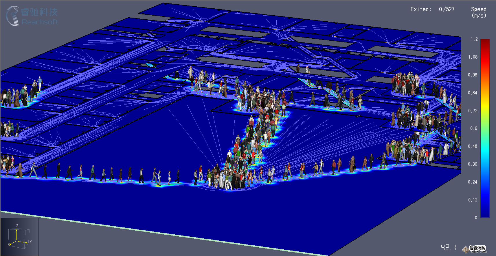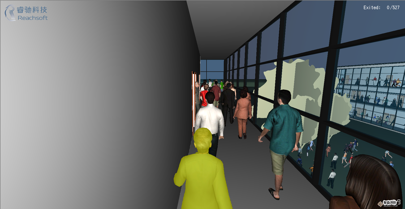 -Pathfinder還專(zhuān)門(mén)提供了高性能可視化的3D時(shí)間歷程模擬,利用透明化功能來(lái)更好地顯示密集人群在樓層中的疏散情況。